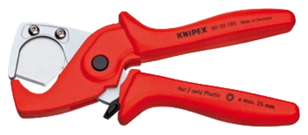 KNIPEX Plaströrskap 185 mm PlastiCut® är ett professionellt verktyg för snabb och exakt kapning av tunnväggade plaströr och slangar upp till 25 mm i diameter.