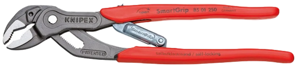 KNIPEX SmartGrip® 8501250 är designad för montörer och tekniker som behöver effektivitet och flexibilitet i sitt arbete. Tack vare den unika automatiska mekanismen anpassar sig käftarna direkt vid kontakt med arbetsstycket – helt utan manuell justering. Den självlåsande funktionen ger ett säkert grepp på både rör och muttrar, medan den slimmade designen och enhandsmanövreringen gör verktyget bekvämt att använda även i trånga utrymmen. Ett pålitligt och smart val för service, VVS, industri och fordonsverkstäder.