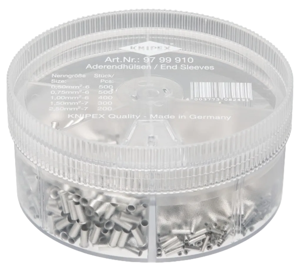 KNIPEX 97 99 910 är en transparent och stapelbar sortimentslåda fylld med över 1900 oisolerade ändhylsor i fem vanliga storlekar.