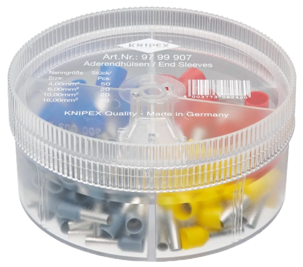 KNIPEX 97 99 907 är en praktisk sortimentslåda med isolerade ändhylsor enligt DIN-färgkod, perfekt för professionellt elarbete.