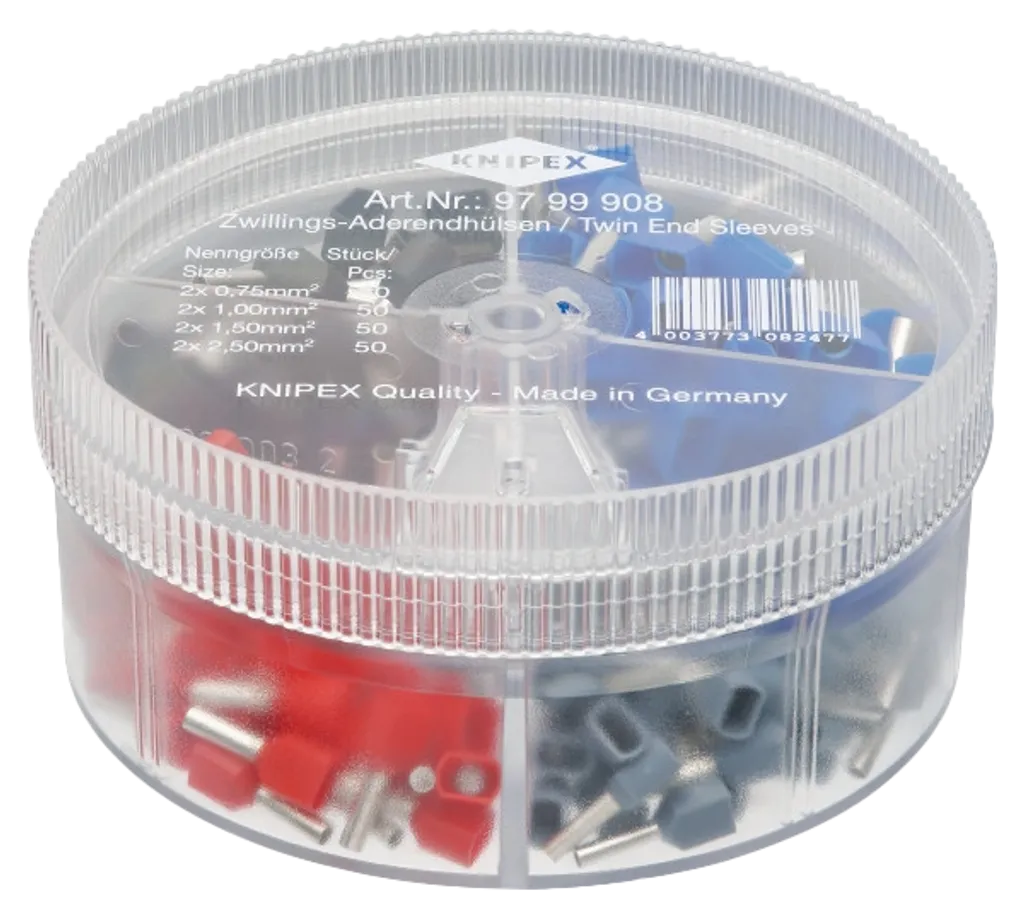 KNIPEX 97 99 908 är en transparent, lätthanterlig sortimentslåda fylld med isolerade twin-ändhylsor i fyra vanliga dimensioner – perfekt organiserade och färgkodade enligt DIN-standard.