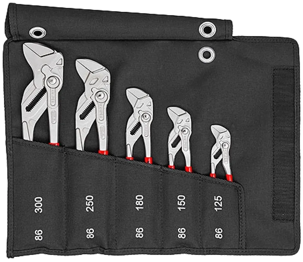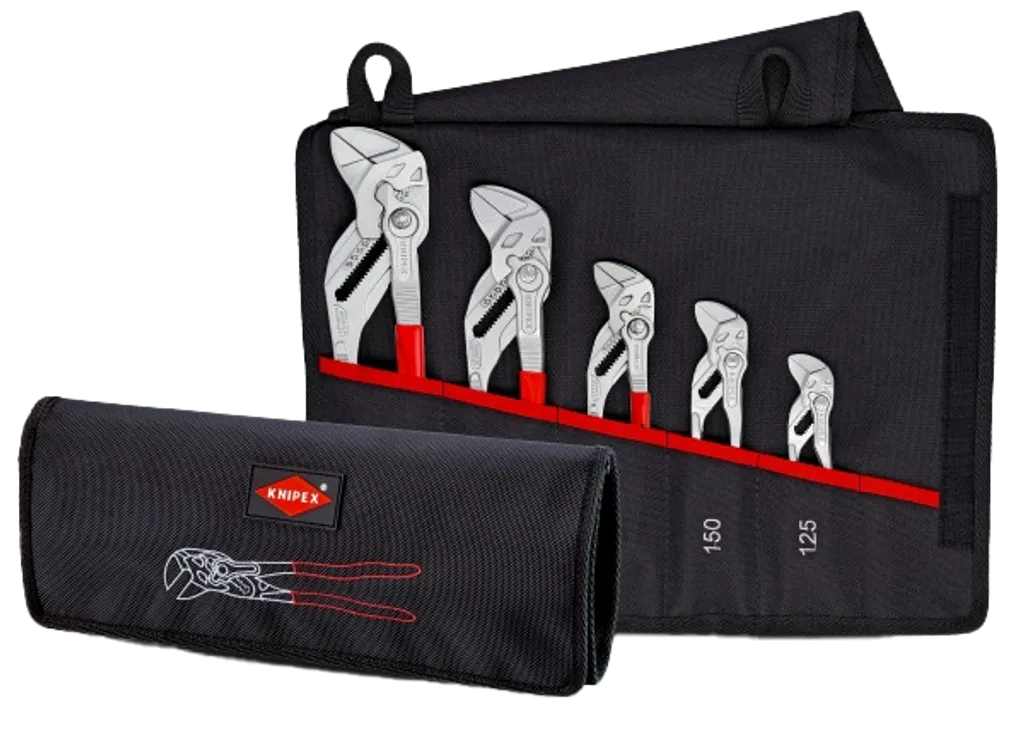 KNIPEX Tångnyckelset 5 delar är en komplett uppsättning justerbara tång- och skruvnycklar – levererade i ett slitstarkt etui av polyesterväv med kardborrstängning för enkel transport och ordnad förvaring.