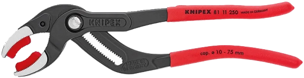 KNIPEX 8111250 är en mångsidig specialtång för VVS, service och industribruk. Med kapacitet upp till 75 mm och hela 25 justeringslägen erbjuder den flexibilitet och precision i arbetet. De utbytbara plastbackarna i tvåkomponentsmaterial skyddar känsliga ytor samtidigt som de ger ett säkert grepp, vilket gör tången oumbärlig för tekniker som arbetar med vattenlås, filter, slangar och plastkopplingar.