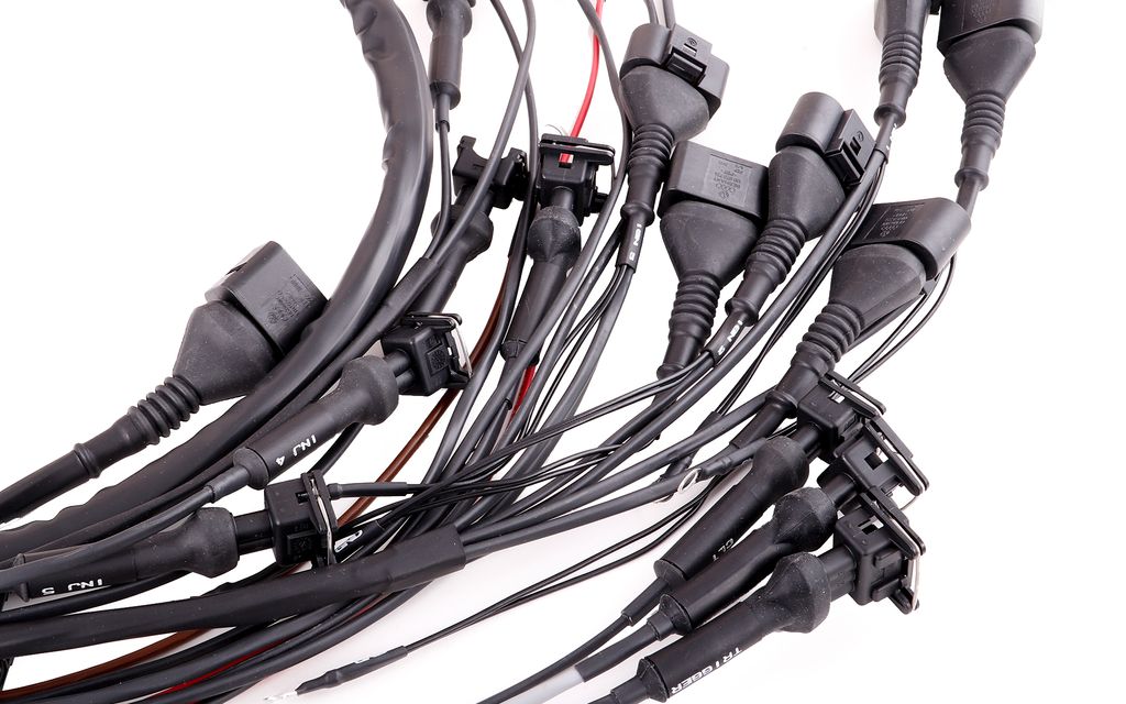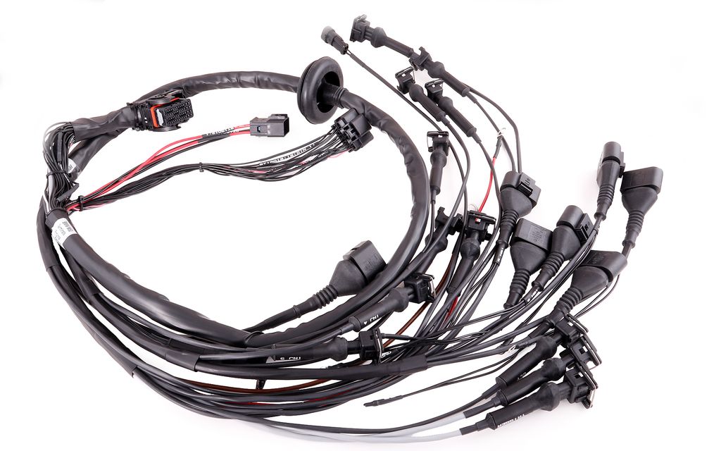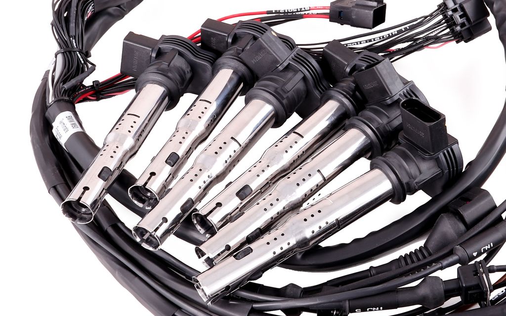 Kabelhärvan är anpassad för långa VAG-typ tändspolar som ingår i leveransen och är förberedd för de vanligaste motorsignalerna. Startmotor- och generatoranslutningar är inkluderade, liksom extra kontaktdon för laddtrycksstyrning och VANOS. Motorns två knackgivare är inte kontakterade som standard, vilket ger flexibilitet beroende på applikation.