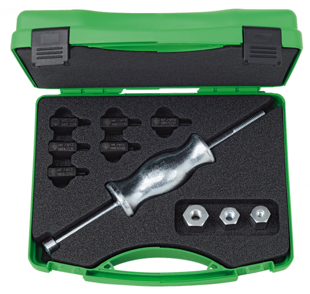 Setet är utvecklat för yrkesanvändare som kräver precision, styrka och pålitlighet. Med den slitstarka glidhammaren och sex gängadaptrar kan du effektivt dra ut fastrostade eller pressade delar inom bilverkstad, industri och fordonservice.