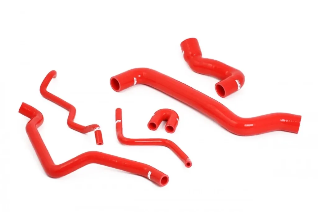 Kylarslangar i Röd silikon för Saab 9-5 (02–10). Ett komplett slangkit som ersätter originalslangar i kylsystemet och ger förbättrad hållbarhet, hög trycktålighet och ett sportigt, professionellt utseende i motorrummet.