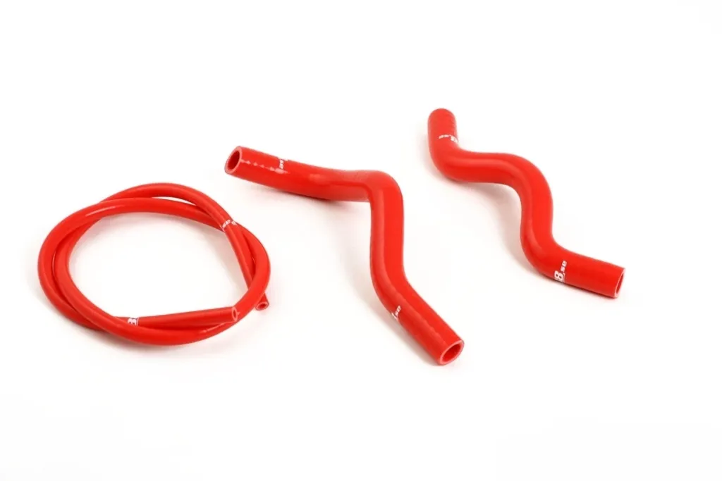 Slangarna är tillverkade av högkvalitativt silikon med tre till fem lager armering beroende på innerdiameter. Den robusta konstruktionen bibehåller form och funktion även vid höga temperaturer och tryck. Originalslangar i gummi spricker ofta med tiden på grund av uttorkning – detta kit eliminerar problemet helt. Färgval påverkar inte prestandan, men Rött utförande ger ett distinkt och sportigt intryck. För optimal installation rekommenderas matchande slangklämmor under fliken Tillbehör.