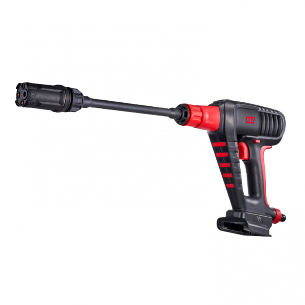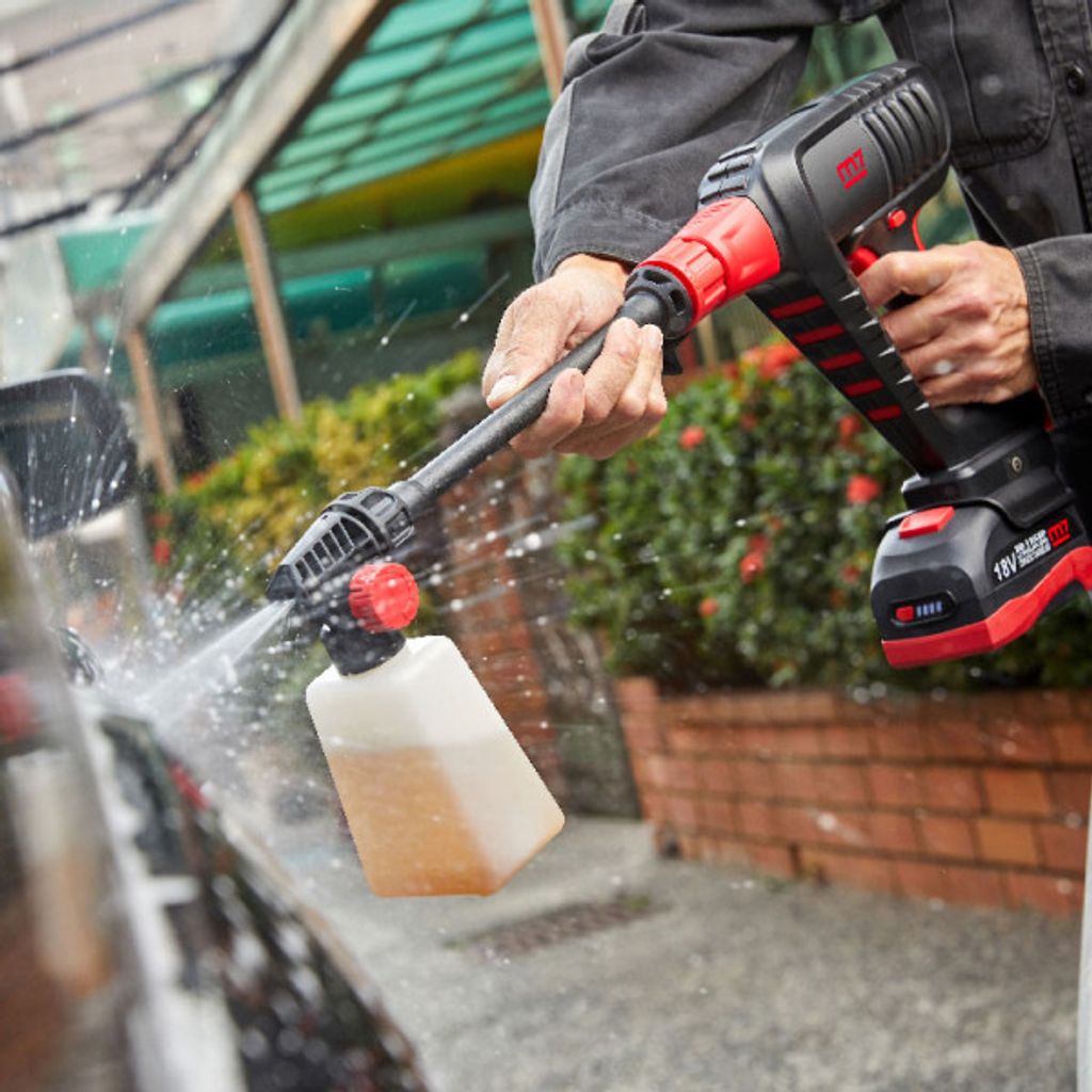 Portabel och batteridriven högtryckstvätt med 25 bar tryck, 4-i-1-munstycke och flexibel vattenanslutning.