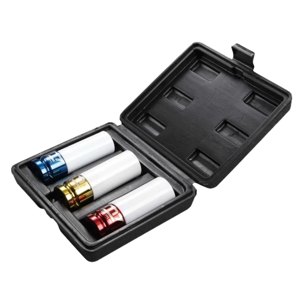 Hylsorna har färgkodning för enkel identifiering och är försedda med ett skyddande polymerhölje som minimerar risken för repor eller skador på fälgarna. Den extra längden på 85 mm gör det lättare att nå in i djupare bultkanaler, vilket gör setet idealiskt för hjulservice och professionella verkstäder.