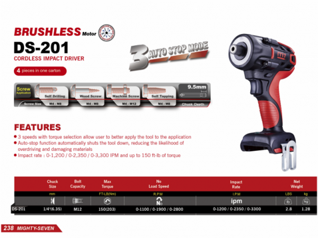 - DS-201 – Levereras utan batteri och laddare (för dig som redan har M7:s 18V-system)