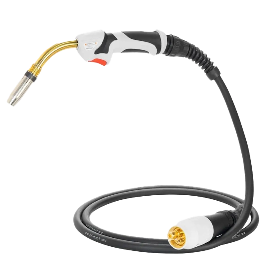 Migbrännare M24 är en slitstark och effektiv MIG-brännare för svetsning med hög precision och hållbarhet. Den gaskylda designen gör den enkel att använda utan behov av extern kylare. Brännaren finns i tre längder, 3, 4 eller 5 meter, för maximal flexibilitet i både verkstad och fält.