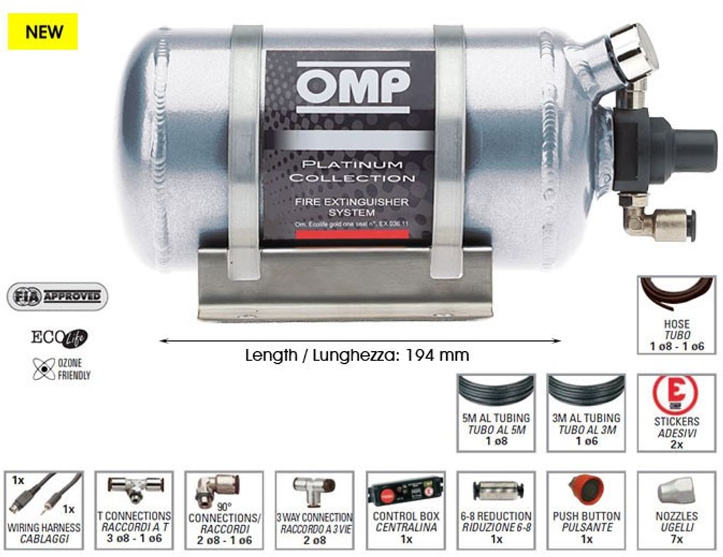 Ett kompakt och ultralätt elektriskt brandskyddssystem från OMP med 0,9 L aluminiumflaska, fyllt med Ecolife-släckmedel och elektrisk aktivering via kontrollbox – särskilt utvecklat för formelbilar med krav på högsta säkerhet.