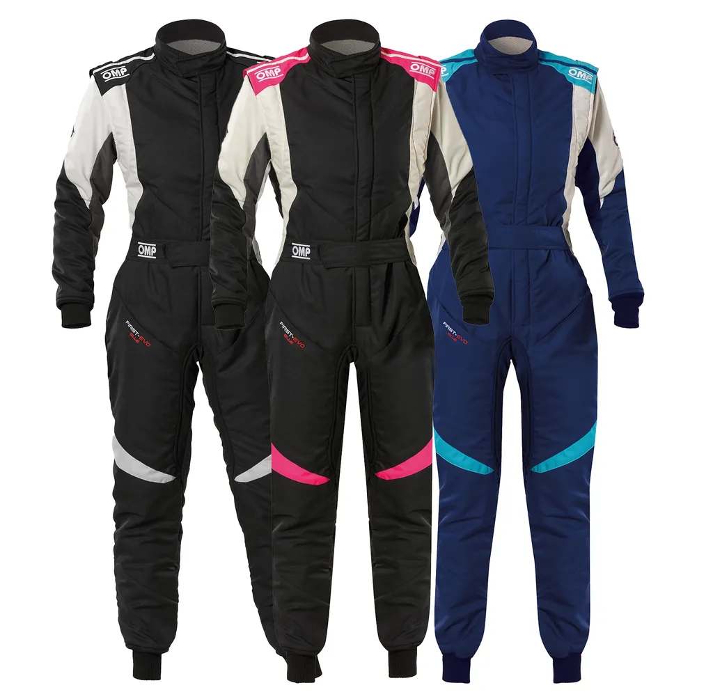FIA 8856-2018-godkänd racingoverall från OMP – ergonomiskt designad för kvinnor med lätt konstruktion, ventilation och full rörelsefrihet.