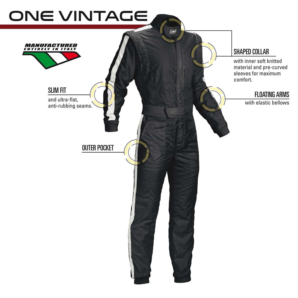 OMP ONE Vintage overall, retro racingoverall, FIA 8856-2018 tävlingsdräkt, klassisk racingstil, lätt racingoverall, motorsport overall OMP
