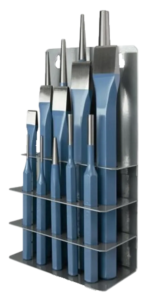 Satsen innehåller ett brett sortiment av mejslar, dorn, körnare och spikdrivare – tillverkade i högkvalitativt stål för lång livslängd och maximal slitstyrka. Levereras i ett robust plåtställ som kan monteras på vägg eller bänk för enkel åtkomst och organiserad förvaring.