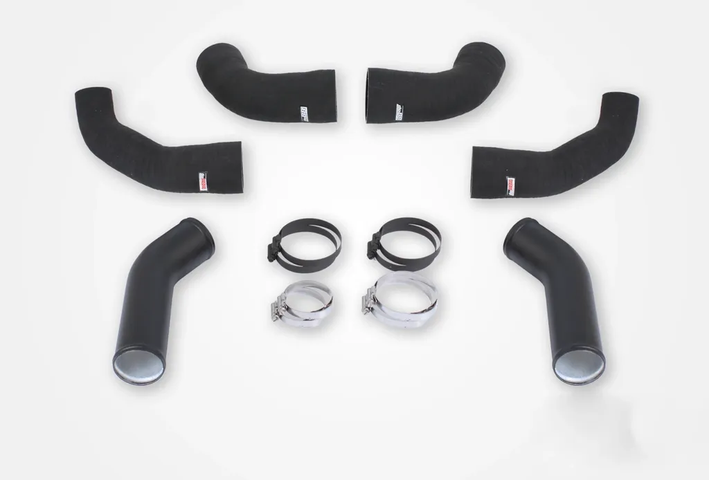 Rören är tillverkade av 63 mm dornbockade aluminiumrör som pulverlackerats i en matt svart strukturfinish. Konstruktionen ger lågt tryckfall och längre livslängd. Medföljande silikonslangar är framtagna för höga temperaturer, där slangarna på turbons utlopp har en särskild armering som tål upp till 240 °C kontinuerlig temperatur. Slangklämmorna i dessa positioner är av typen “constant tension”, vilket kompenserar för materialens temperaturvariationer och garanterar tät montering över tid.