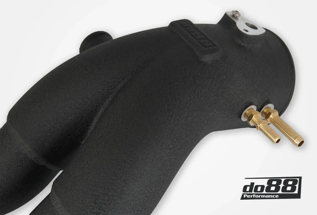Röret är pulverlackerat i svart för både snygg finish och lång hållbarhet. Det levereras som ett komplett kit med specialdesignade silikonslangar och slangklämmor – anpassade för montering tillsammans med performance-intercooler.