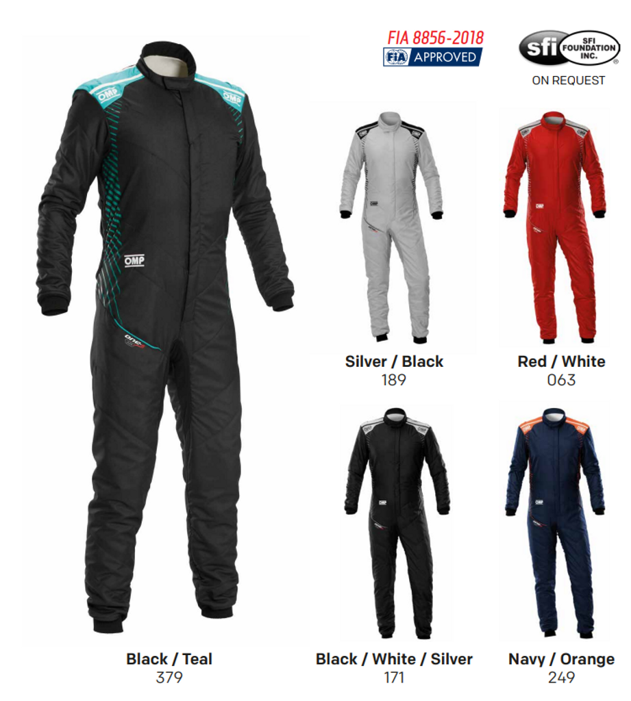 Racingoverallen är tillverkad med OMP AIR-teknik och väger 18 % mindre än föregående modell. Materialet erbjuder 10 % högre andningsförmåga och har ett minimalt snitt som underlättar anpassning med teamlogotyper. Förformade ärmar, stretchpaneler i rygg, gren och armhål samt ultraflata sömmar bidrar till optimal rörelsefrihet och komfort. FIA 8856-2018-godkänd för användning i professionell motorsport.