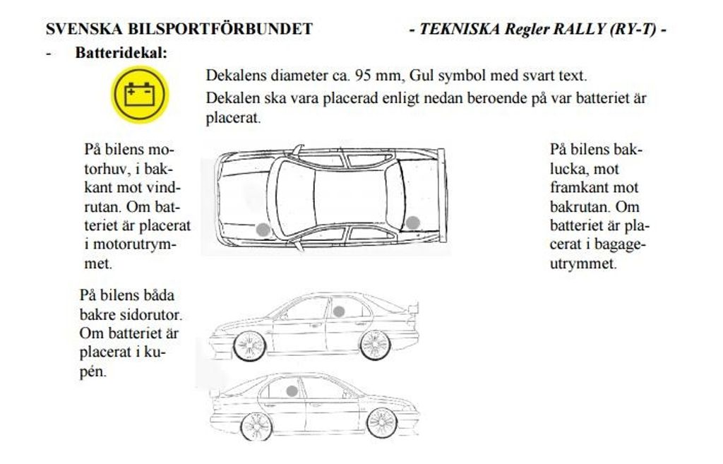 batteri dekal sbf, racing dekal batteriplacering, rally batterimärkning, motorsport säkerhetsdekal, batteriplacering etikett