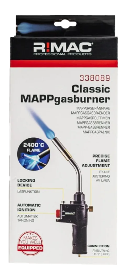 RIMAC Classic 338089 är en slitstark och kraftfull gasbrännare med automatisk Piezo-tändning och justerbar låga som kan låsas för längre uppvärmningsmoment. Brännaren är tillverkad i metall för att tåla tuffa arbetsmiljöer inom bygg, VVS och verkstad. Den är kompatibel med standard MAPP-gasflaskor (US 1” gänga) och levereras utan gas – vi rekommenderar RIMAC MAP-gas (art.nr 511662) som tillval.