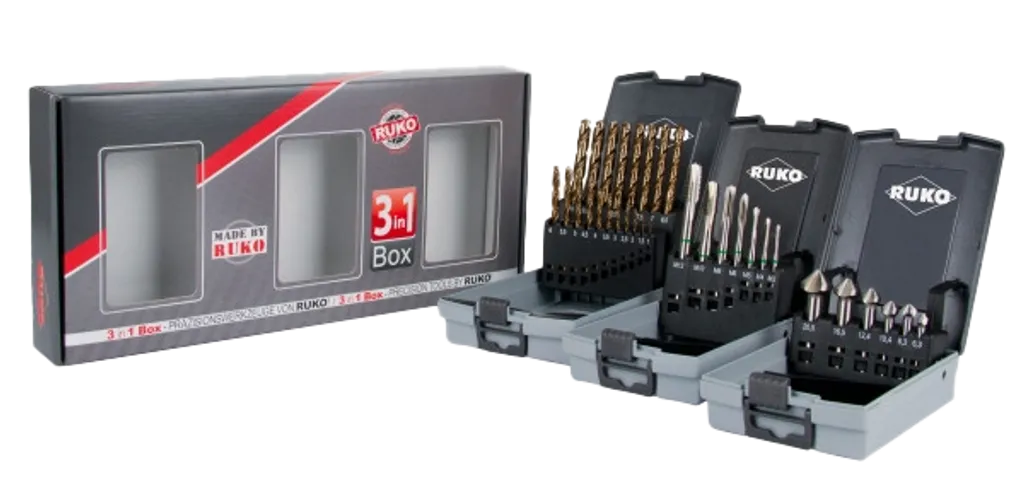 RUKO 131003 är en komplett 3-i-1-sats som innehåller spiralborrar, gängtappar och försänkare – allt du behöver för professionell håltagning, gängning och efterbearbetning i metall.