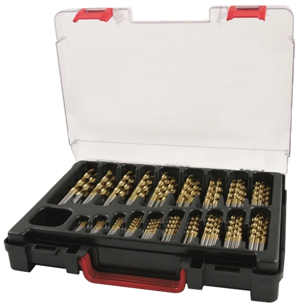 RUKO A250200RO är en industrilåda med 170 krysslipade HSS-borrar belagda med Titanium Nitride (TiN), vilket ger ökad slitstyrka, värmetålighet och längre livslängd vid krävande borrning.