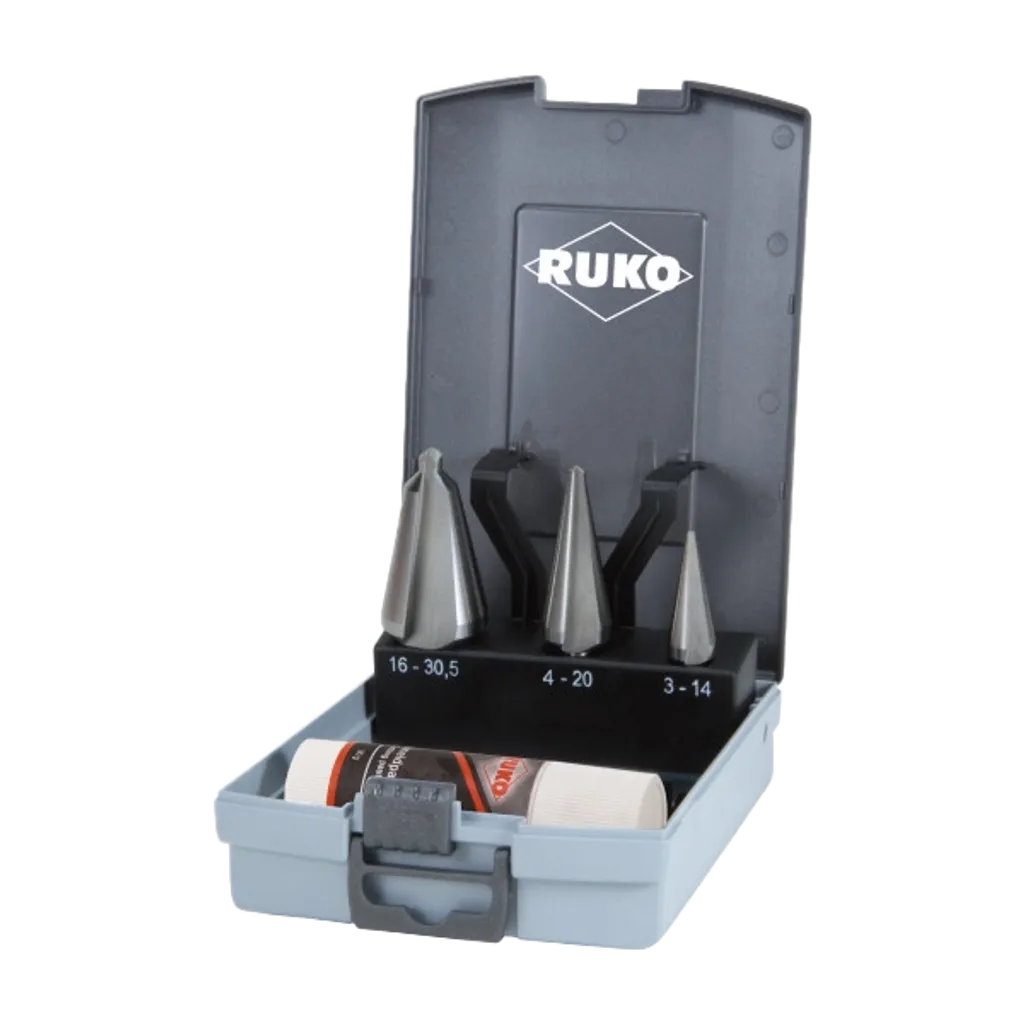 RUKO Borrsats 101020RO är ett komplett kit med tre HSS-stegborrar och en 90° försänkare – perfekt för håltagning och efterbearbetning i plåt, rör och tunnväggiga material.