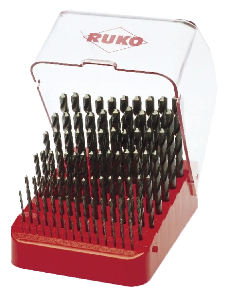 RUKO 214223 är en professionell borrsats med 91 krysslipade spiralborrar i finsteg från 1,0 till 10,0 mm i 0,10 mm-steg – utvecklad för maximal precision i varje dimension.