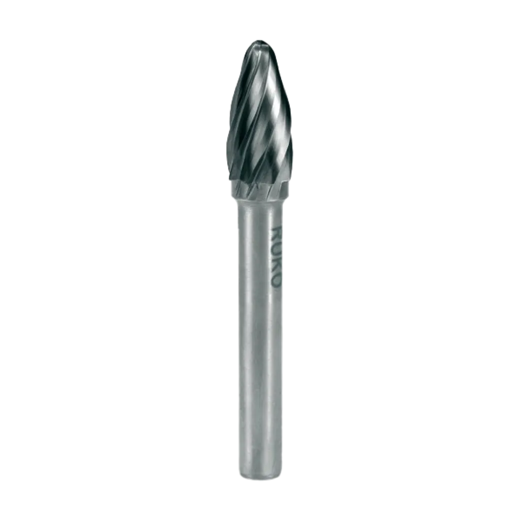 RUKO:s roterande hårdmetallfilar i Form F ALU är utvecklade för effektiv bearbetning av aluminium och andra mjuka metaller – med rundad spets för exakt kontroll och jämna konturer.
