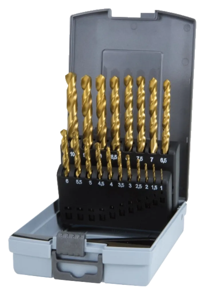 En högpresterande borrsats med HSS-spiralborrar belagda med titannitrid (TiN) för optimal slitstyrka och värmetålighet.