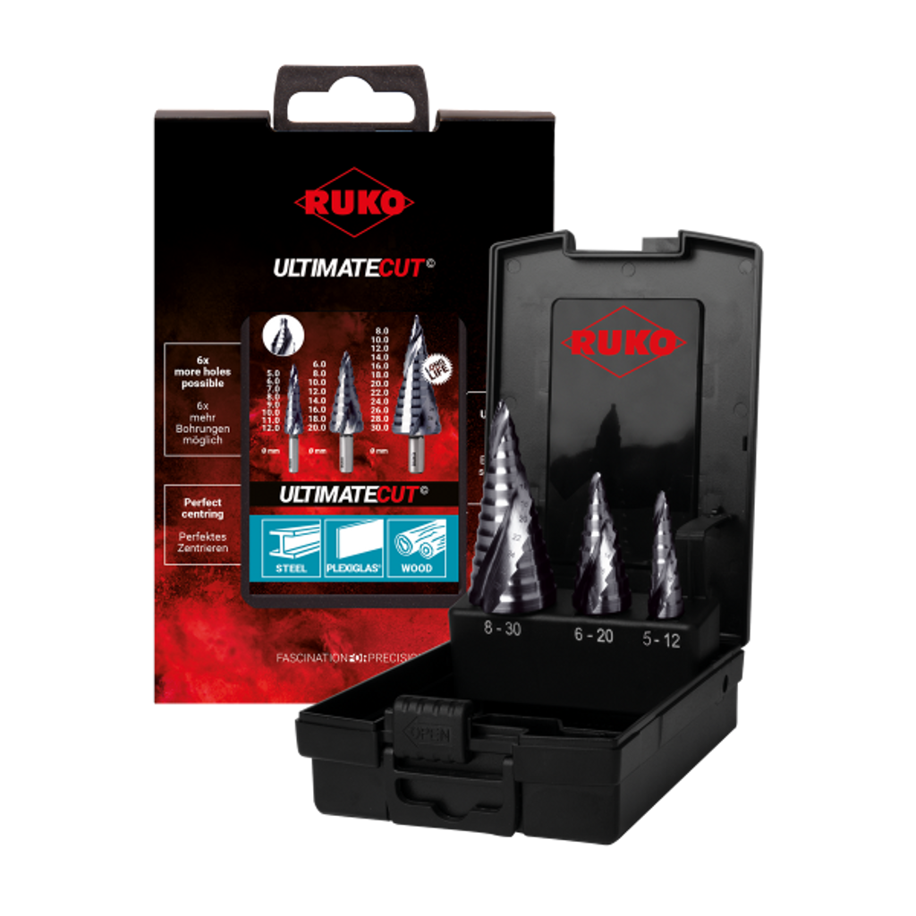 RUKO Ultimatecut 101626PRO är ett avancerat 3-delars stegborrset i HSS med FlowStep®-spets och RUnaTEC nano-beläggning – utvecklat för snabb, exakt och kraftbesparande borrning.