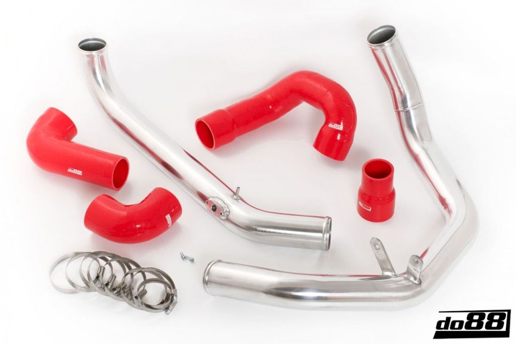 Kitet består av 63 mm (2,5”) extruderade aluminiumrör som är dornbockade för optimal passform och flöde. Slangarna är tillverkade i högkvalitativ 4-lagers silikon med polyester- och aramidförstärkning, vilket ger hög tryck- och temperaturtålighet. Konstruktionen ger ett betydligt högre luftflöde än originalrören, vilket förbättrar gasrespons, effekt och tillförlitlighet – särskilt vid höjt laddtryck eller mjukvaruuppgradering.