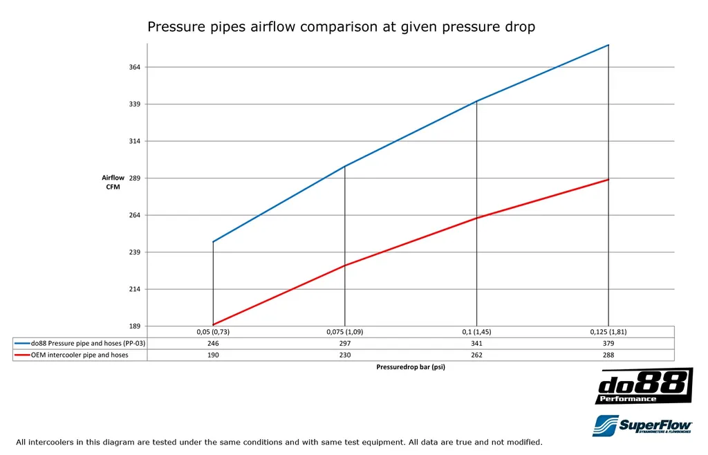 Detta diagram visar luftflöde vid olika tryckfall för do88 tryckrör jämfört med original tryckrör: