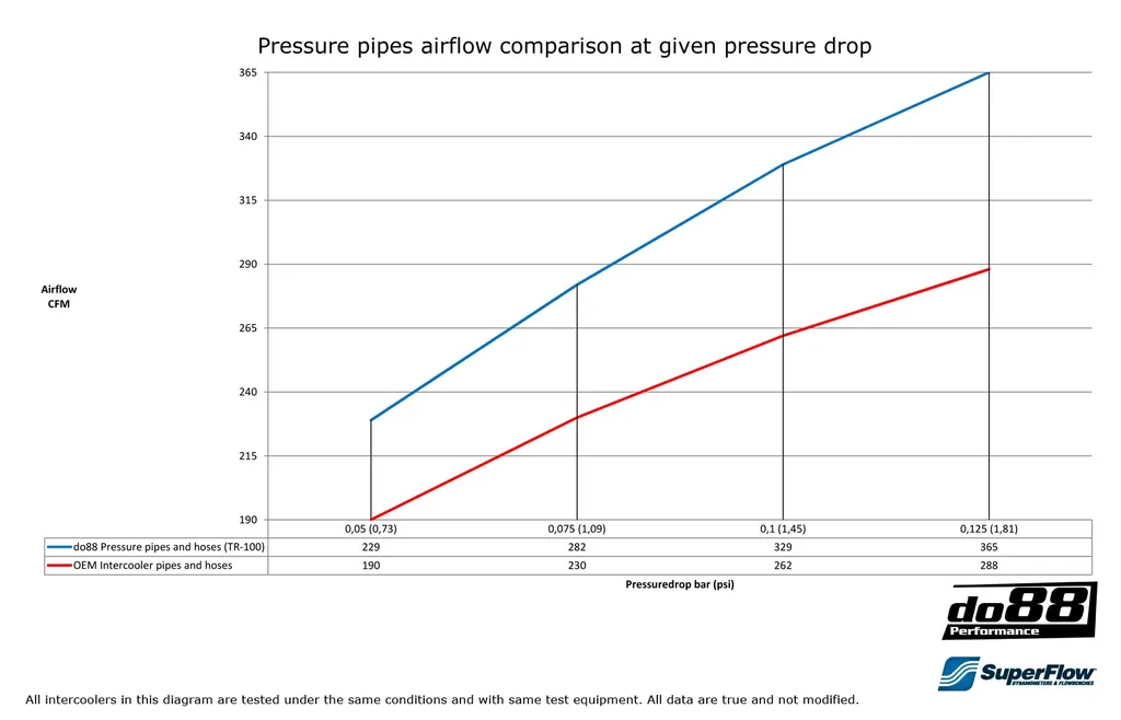 Tryckrören är tillverkade av 60 mm (2,375”) extruderat aluminium som dornbockats till exakt form för perfekt passform. Den CNC-bearbetade givarflänsen säkerställer hög precision och tätning. Systemet levererar upp till 32 % högre luftflöde jämfört med original – verifierat både i bil och i SuperFlow SF-1020 flödesbänk.