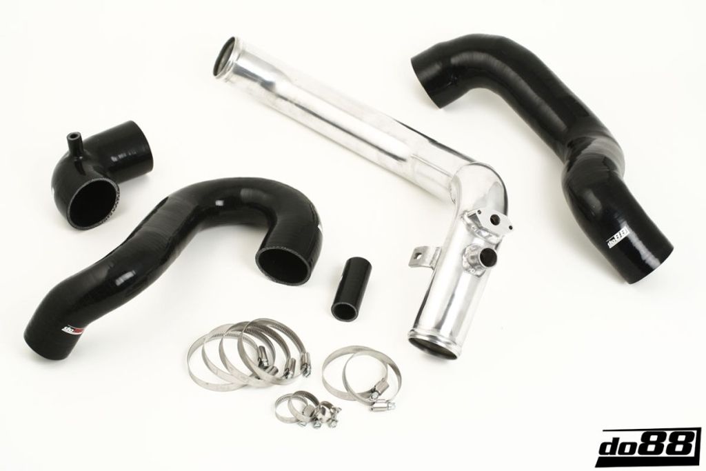 Tryckrörspaket för SAAB 9-5 (01–09) med svarta silikonslangar – utvecklat för maximal prestanda och pålitlighet. Ett komplett kit som ersätter originalrör och slangar med komponenter avsevärt bättre anpassade för högre effekt, laddtryck och temperatur.
