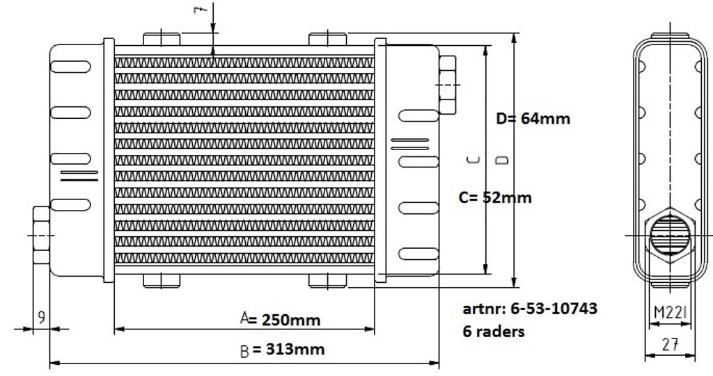 setrab slimline 10743, slimline oil cooler, 6 row slimline, compact oil cooler, m22 oil cooler, short length oil cooler, motorcycle oil cooler, performance cooling system