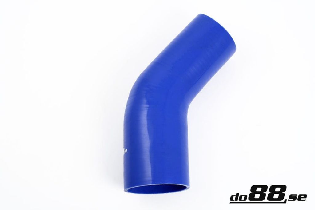 Blå 45 graders böjd reducerande silikonslang med olika innerdiameter i vardera ände. Idealisk för att koppla samman komponenter med olika dimensioner i tryck- eller sugapplikationer, exempelvis mellan turbo, intercooler, insug eller luftfilter. Även lämplig för transport av kylvätska i kylsystem.