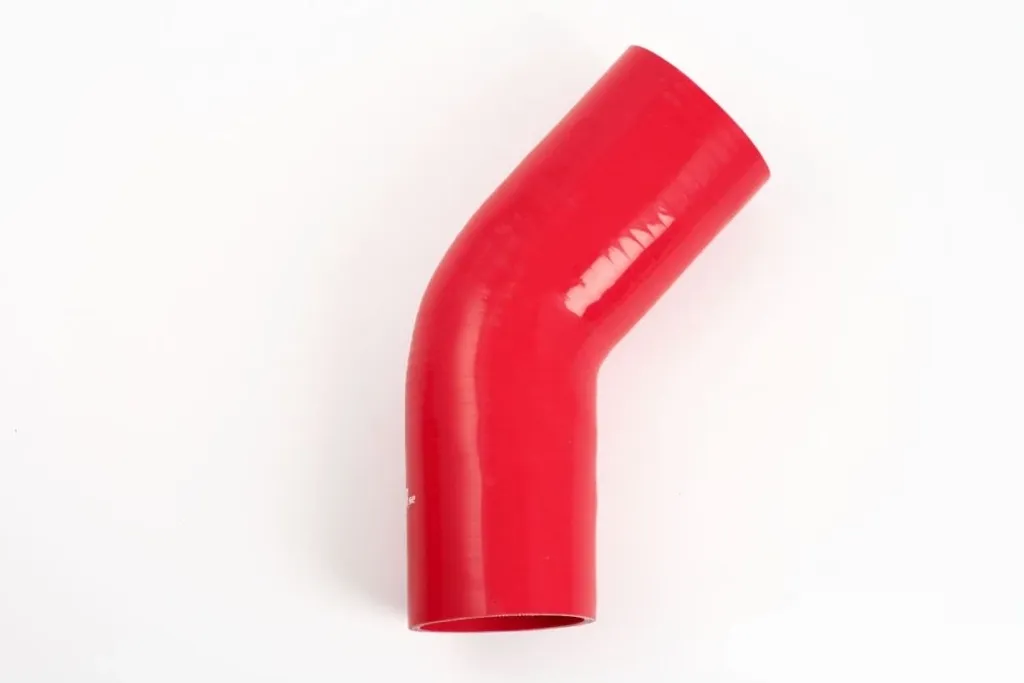 Silikonslang Röd 45° 3,5" (89mm) är en böjd slang avsedd för tryck- och sugapplikationer som turbo, intercooler och insug. Den 45° böjda konstruktionen gör den idealisk vid trånga installationer där ett mjukt flöde behöver bibehållas utan skarpa vinklar.