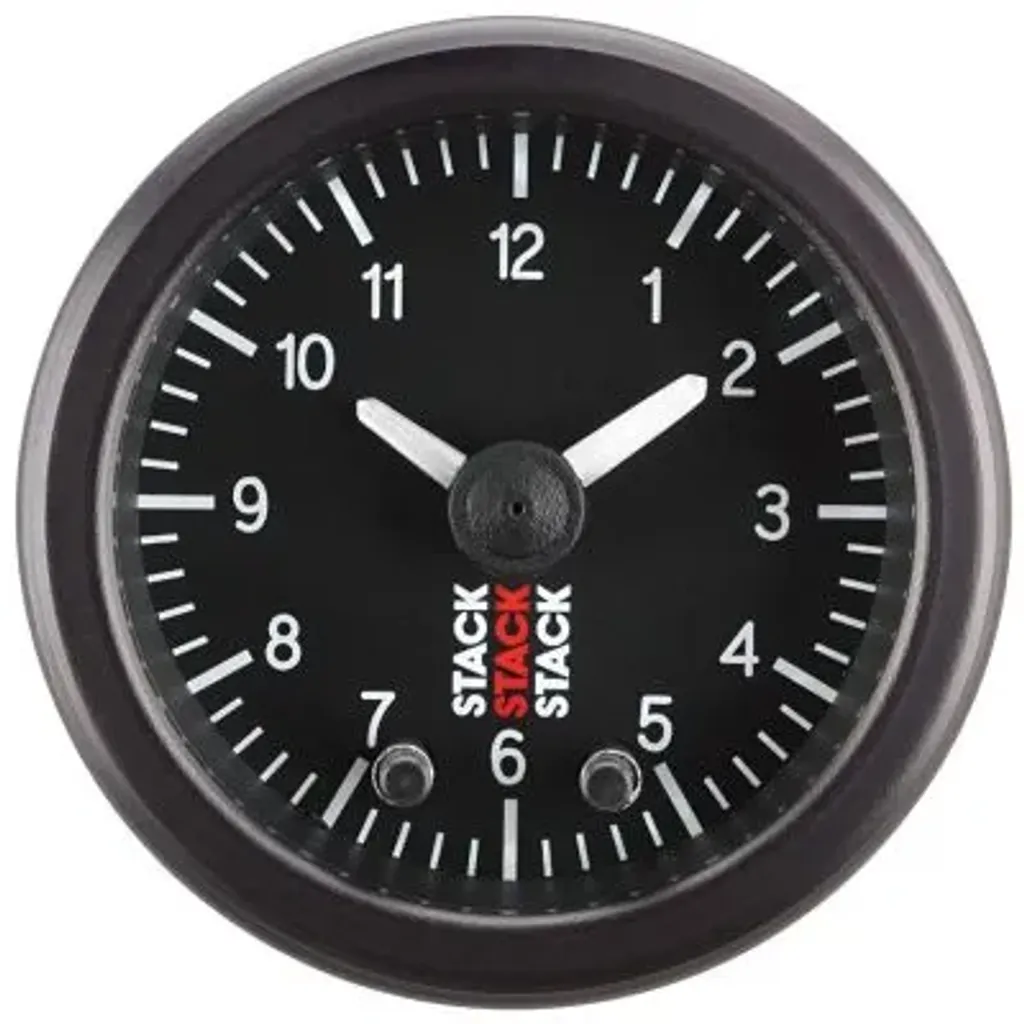 Stack analog klocka är ett 12-timmars mätarinstrument som är gjort för att passa perfekt med andra Stack instrument i ditt fordon. Den är utrustad med vit LED-bakgrundsbelysning och belysta visare, vilket gör den lätt att läsa av även i mörker – perfekt för både racing, banbil och gatbruk.