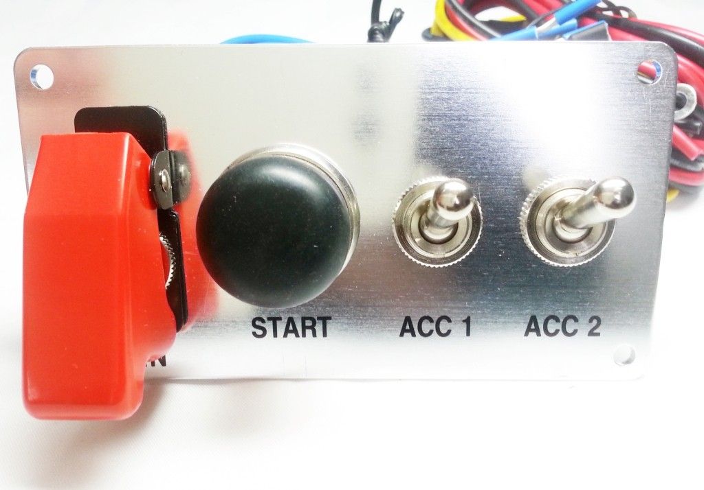 Kompakt och robust startpanel med startknapp, två strömbrytare och vippströmbrytare med skyddslock – framtagen för rally och racing.