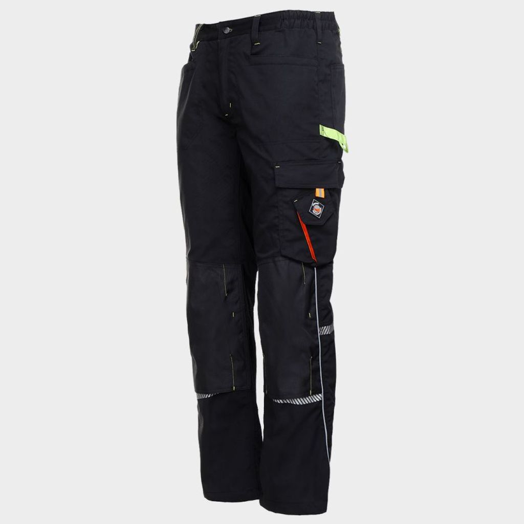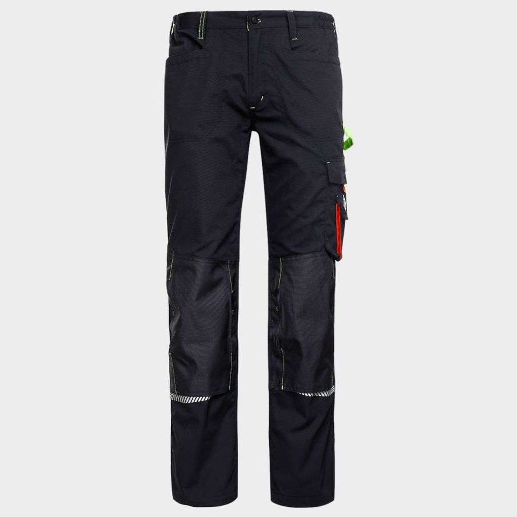 Slitstarka och funktionella arbetsbyxor med förstärkta knän, reflexdetaljer och smart fickdesign – ett pålitligt val för proffs.
