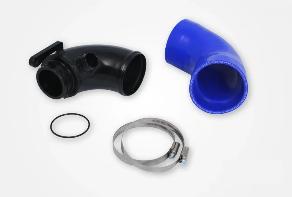 Original inloppsrör är dimensionerade för bilens standardeffekt och blir en begränsning vid trimning, mjukvaruuppgradering eller höjt laddtryck. Detta högflödesrör har en diameter på 76 mm (3”) jämfört med originalets 70 mm, vilket ger 35 % större flödesarea. CNC-bearbetad turbofläns, optimerad radie och silikonslang med stegad insida reducerar turbulens och ökar luftflödet. Resultatet blir snabbare spool, högre effektivitet och mer motoreffekt.