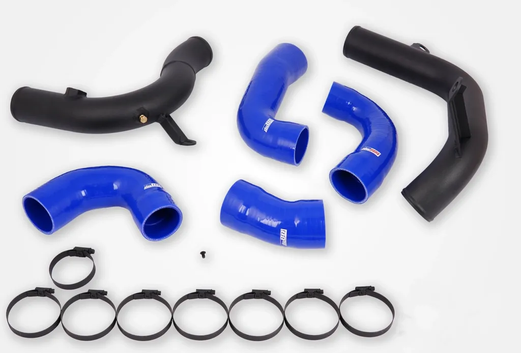 Tryckrör i aluminium för VAG 2.0 TSI EA888 Gen4 (245hk) med Blå silikonslang. Ett högpresterande uppgraderingskit utvecklat för att ge avsevärt förbättrat luftflöde jämfört med originalsystemet. Perfekt för dig som vill öka motorns prestanda och säkerställa stabil drift vid högt laddtryck.