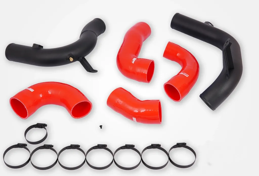 Tryckrörssats i aluminium med röda silikonslangar för 2.0 TSI-motorer (EA888 Gen4, 245 hk). En uppgradering som ger förbättrat luftflöde, stabilare laddtryck och högre hållbarhet vid effektökning.