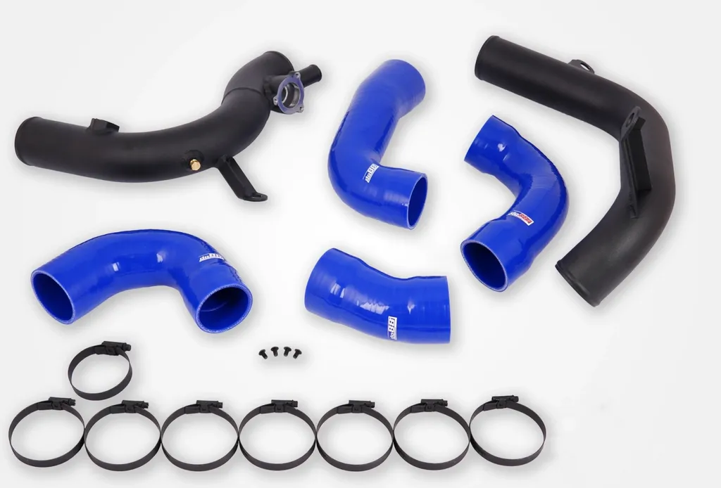 Tryckrör i aluminium för VAG 2.0 TSI EA888 Gen4 (300hk+) med Blå silikonslang. Ett högpresterande uppgraderingskit utvecklat för att ge avsevärt förbättrat luftflöde jämfört med originalsystemet. Perfekt för dig som vill maximera motorns effekt och säkerställa stabil drift vid högt laddtryck.