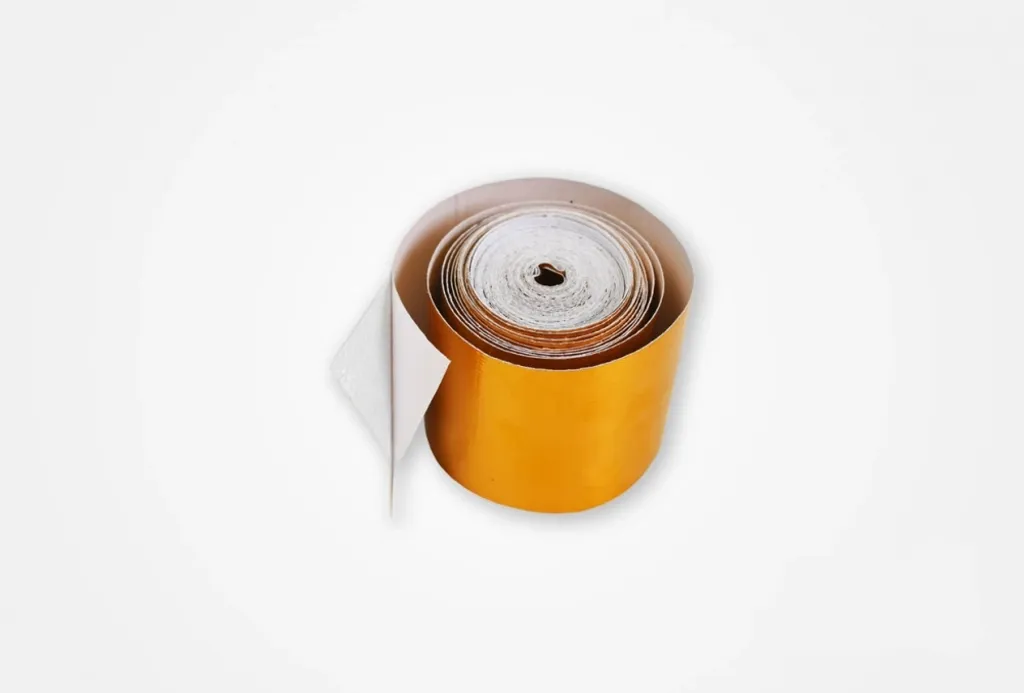 Effektiv värmeskyddstejp i glasfiberväv med guldig aluminiumfolie – skyddar slangar, rör och kablar mot strålningsvärme.