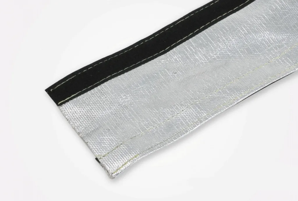 Kompakt värmeskydd i glasfiber med aluminiumyta – enkel montering tack vare kardborrelås och hög värmetålighet.
