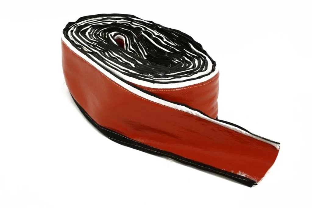 Kompakt värmeskydd med silikonbeläggning och kardborrelås – idealiskt för att skydda slangar, kablar och rör i trånga utrymmen nära värmekällor.