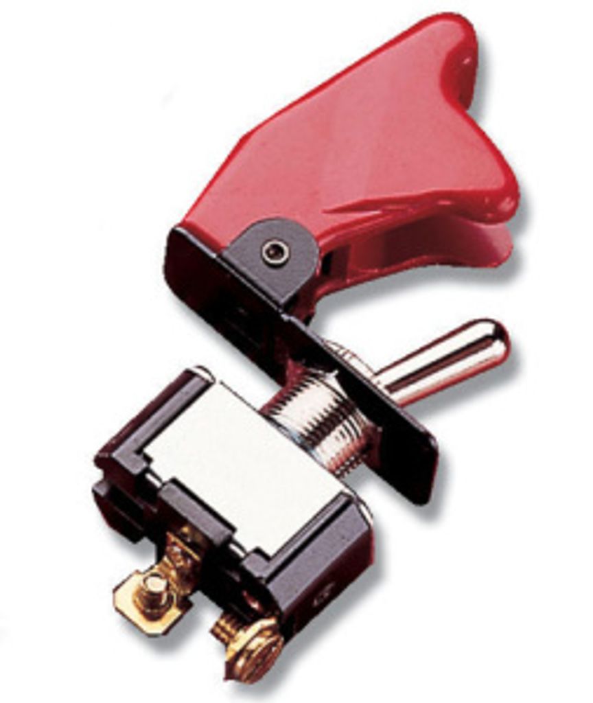 Robust vippströmbrytare med rött säkerhetslock – framtagen för rally, racing och specialbyggda fordon.