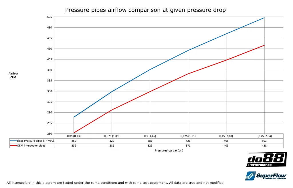 Detta tryckrörspaket är utvecklat för att ge markant förbättrat luftflöde jämfört med original – verifierat i både bil och SuperFlow SF-1020 flödesbänk. Resultatet är upp till 15 % högre flöde, kortare responstid och stabilare laddtryck. Röda silikonslangar med 4-lagers aramidförstärkning säkerställer högsta tålighet mot både värme och tryck.